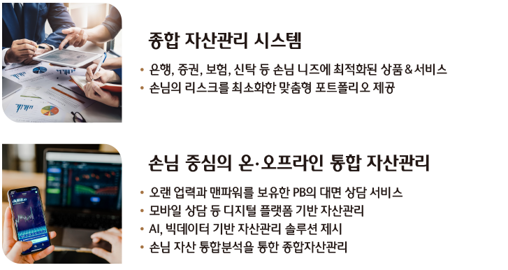 대한민국을 이끄는 초거액 자산가 및 가문의 명성에 걸맞게 대한민국 1등 프라이빗뱅킹의 역량을 모두 담았습니다. 각 분야별 전문가들이 1:1 맞춤형 종합자산관리 서비스를 선보입니다.