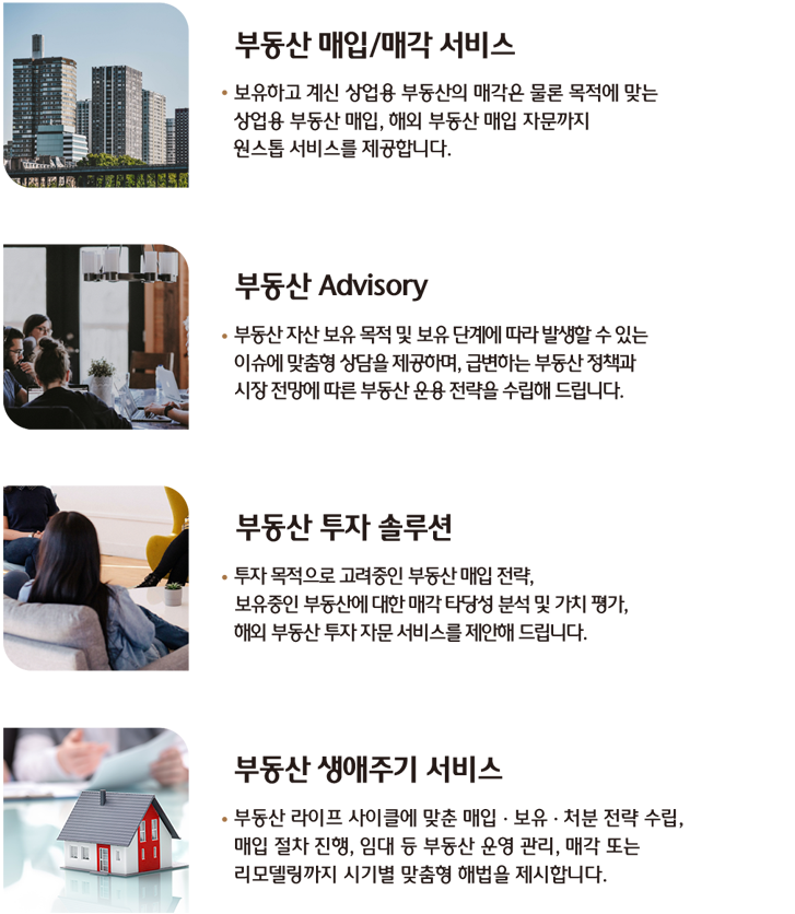 시시각각 변화하는 부동산 시장, 부동산 정책 변화에 따른 효율적인 활용과 투자를 위해 풍부한 경험을 갖춘 전문가가 함께합니다.